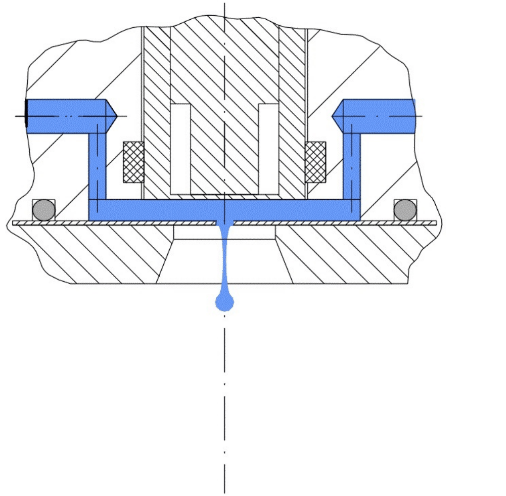 Beschreibung Mit der Inducap®-MATRIX Technologie wird die Kraftwirkung in Form von Druckwellen effektiv genutzt, um vorzugsweise kugelförmige Partikel bzw. Mikropartikel (Mikropellets, Mikrokugeln) in monodisperser Größenverteilung mit großen Durchsatzmengen zu produzieren. Hierbei wird die Ausgangsflüssigkeit (3) unter Zugabe von geeigneten Wirkstoffen und Bindemitteln durch die Düsenöffnungen (4) gedrückt und mittels wechselnder Impulse mit hoher Frequenz in einzelne Flüssigkeitsvolumina (Precursorteilchen) portioniert. Anschließend gelangen die Precursorteilchen in eine Umgebung, die die Verfestigung zu einzelnen Mikropartikeln bewirkt. Die in Form der ausgehärteten Mikropartikel vorliegenden Ausgangsstoffe weisen je nach chemischer Zusammensetzung sowie Form, Größe und Verteilung vorteilhafte chemische, biologische oder physikalische Eigenschaften auf. Kennzeichnend für diese neue Technologie ist unter anderem die konstruktive Sonderausführung der in der Ausgangsflüssigkeit (3) beweglich eingesetzten Aktoren (1, 2). Durch konstruktive Maßnahmen erzeugen die Aktoren lediglich die hydraulischen Impulse (Druckwellen) unter Ausstoß kleinster Precursorteilchen und wirken nicht wie die Verdrängerelemente volumetrischer Pumpen. Im Umkehrschluss hat eine Druckbeaufschlagung auch keinen Einfluss auf die Beweglichkeit der Aktoren, so dass neben der Verarbeitung niedrigviskoser Flüssigkeiten auch hochviskose Fluide bzw. Pasten unter sehr großem Überdruck verarbeitet werden können.