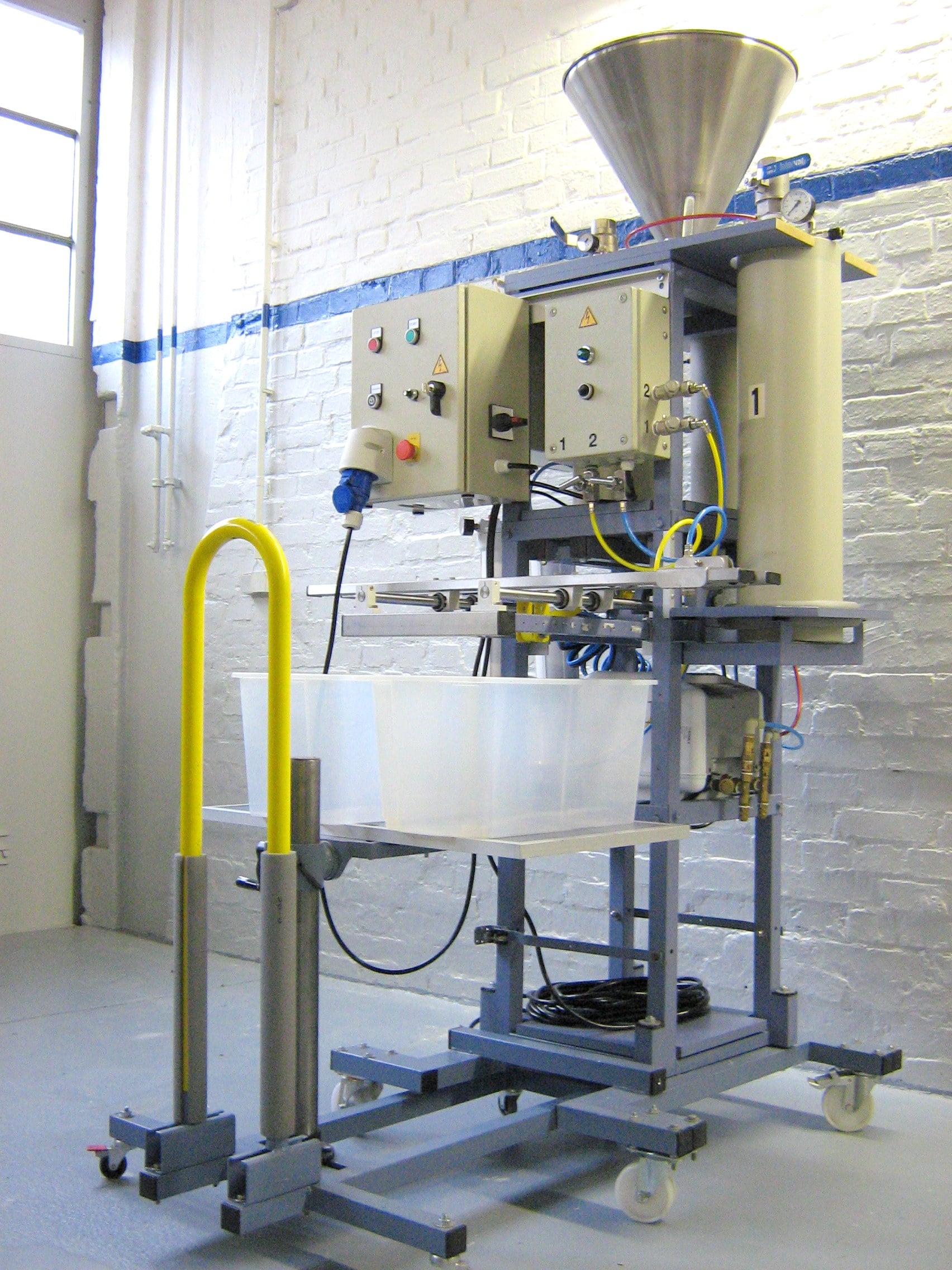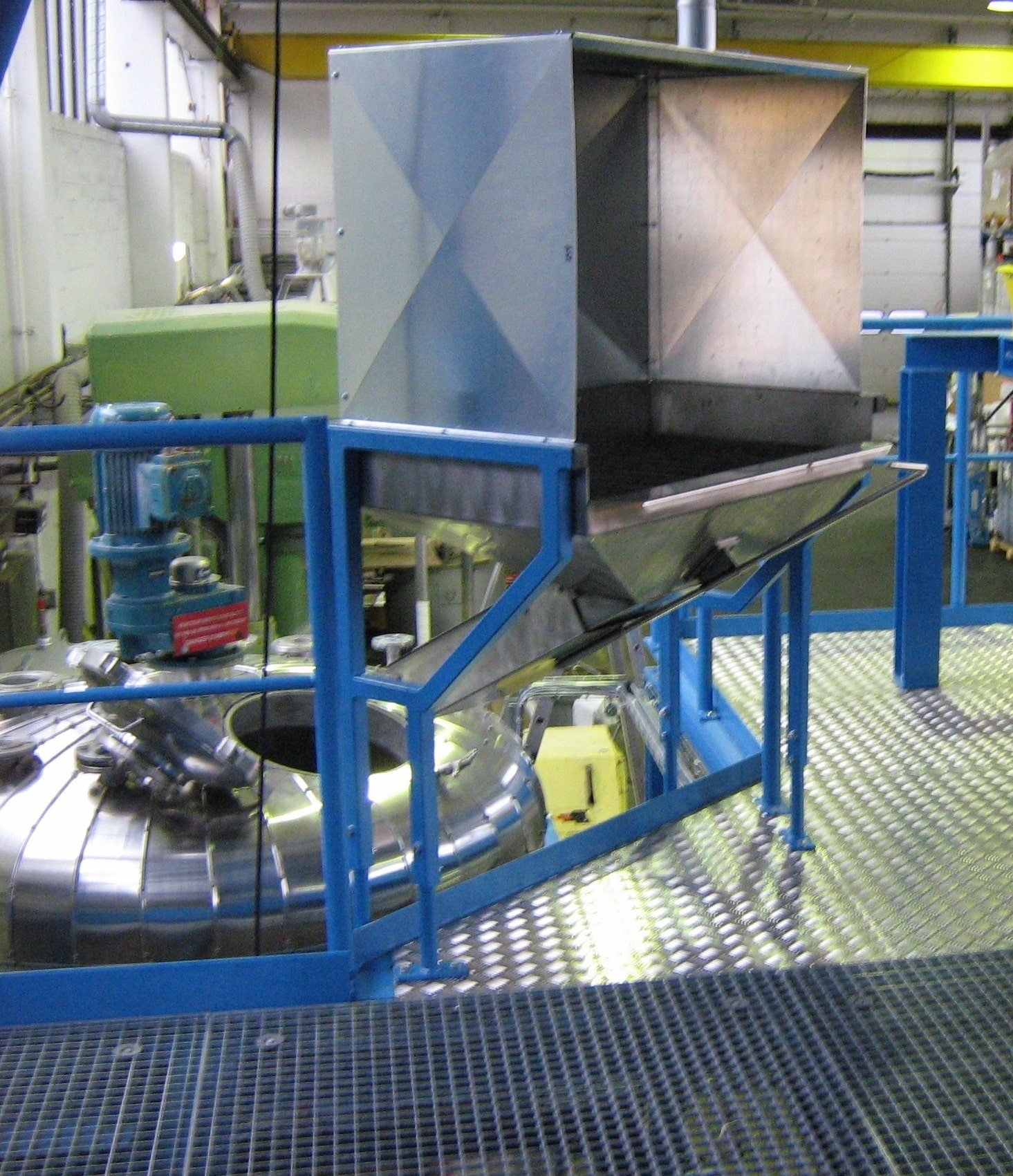 Mobile Schwingförderrinne in Sonderausführung, Förderung und Dosierung von Pigmentpulver in unterschiedlich vorhandene Rührbehälter (Ex-Bereich)