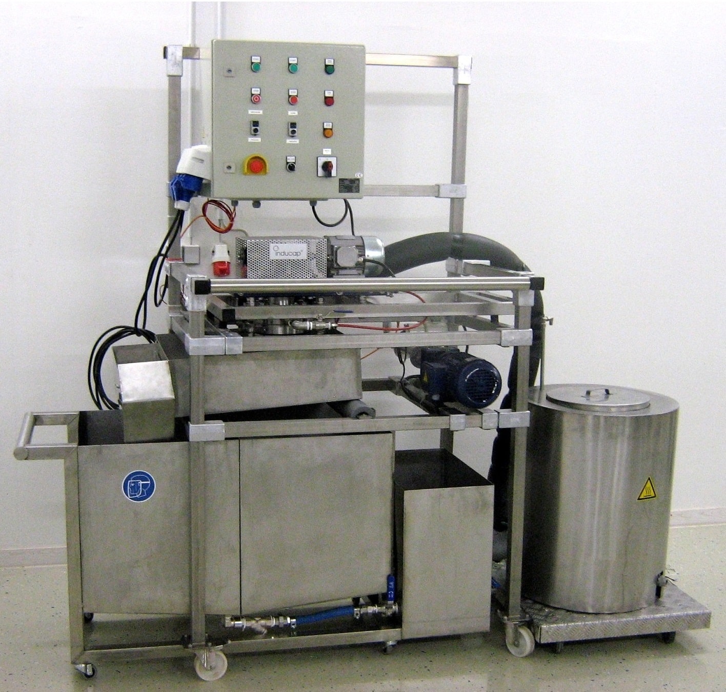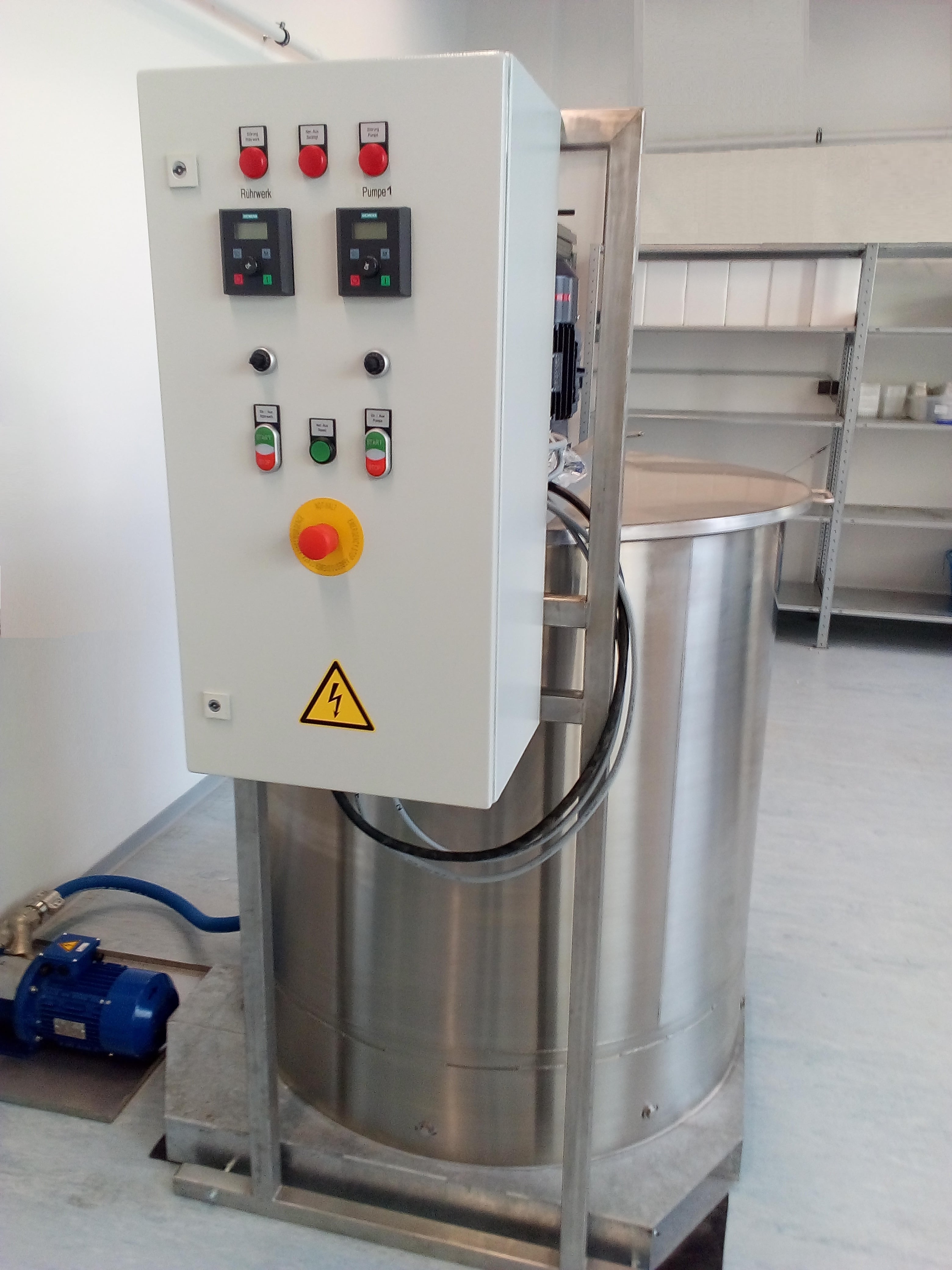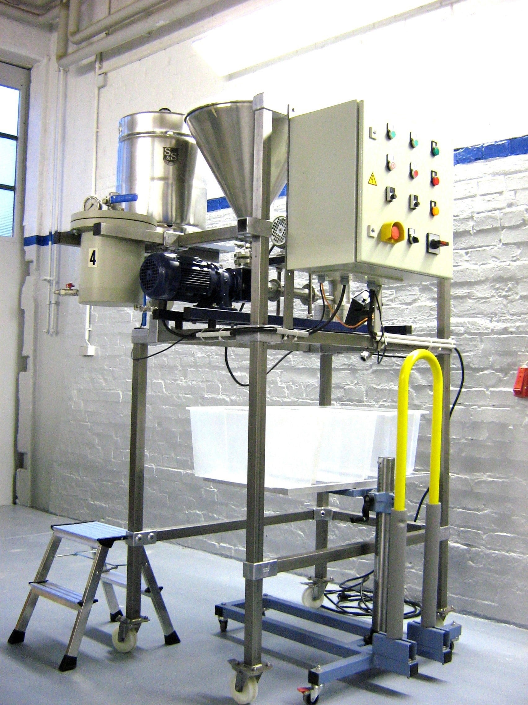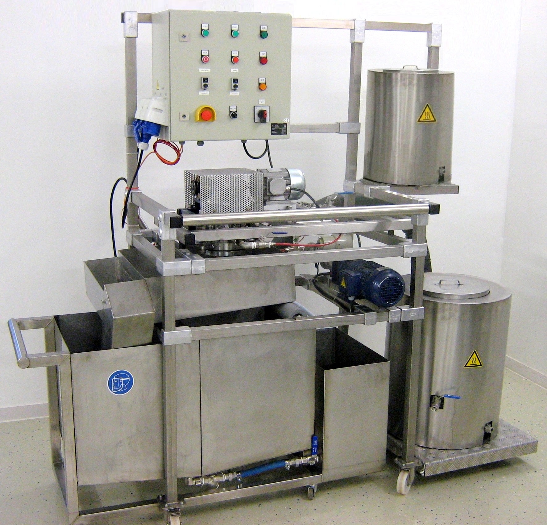 Mobile Technikumsanlage in Sonderausführung zur Herstellung von Mikrokugeln aus Schmelzen bis + 100 °C mit Aushärtung in Kühlflüssigkeit und nachfolgener Separierung